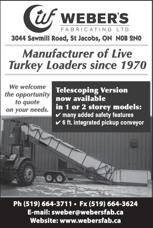 LTD. Weber’s Fabricating is a family owned business, which started manufacturing Live Turkey Loaders in 1970. Clare grew up on a turkey farm and he has first hand knowledge of the turkey business. Today we offer the traditional slider model as well as a telescoping model in either a single or 2 storey. We are a custom job shop and can probably build it if you can think of it. We would be pleased to quote on your needs. Contact us at (519) 6643711 or email Scott Weber, sweber@webersfab.ca