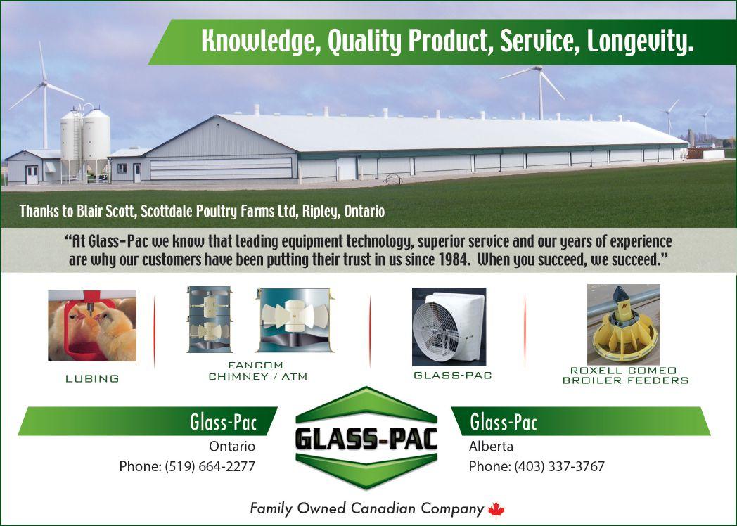 GLASS-PAC Glass-Pac designs and manufactures fibreglass exhaust fans and air inlet systems and also represents a quality line of poultry products from ROXELL - feeding systems, LUBINGdrinking systems, FANCOM - ventilation controls, feed weighing/blending systems, live bird weighing systems, HIRED-HAND - super saver heaters, BRANT RADIANT tube heaters and DELTA TUBE hot water heating. Glass-Pac also offers various breeder nesting systems and more. Our products are sold direct with full design, installation, training and support made available.