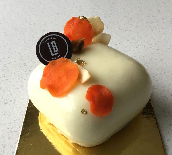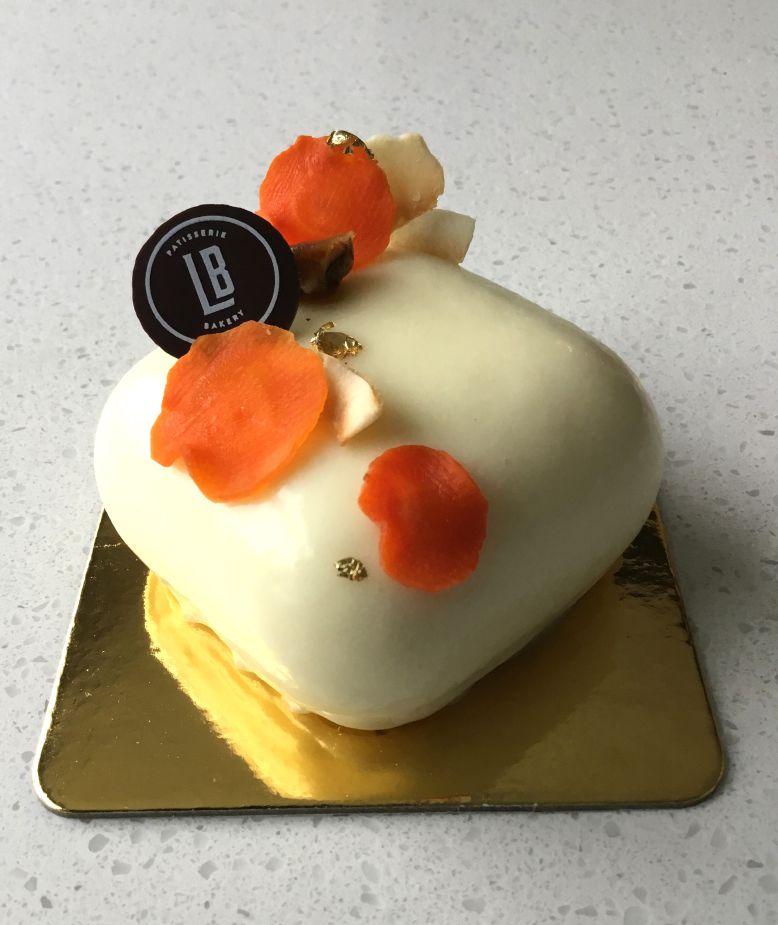 (opposite) La Boule uses pistachio nuts as both a garnish and flavouring; (above) La Boule’s stylish carrot cake is topped with candied carrot slices and flecks of edible gold leaf.