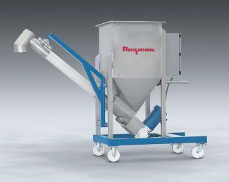Flexicon Corporation created a new low profile flexible screw conveyor with integral bin and caster-mounted frame which can be rolled below mezzanines and other low-headroom areas.