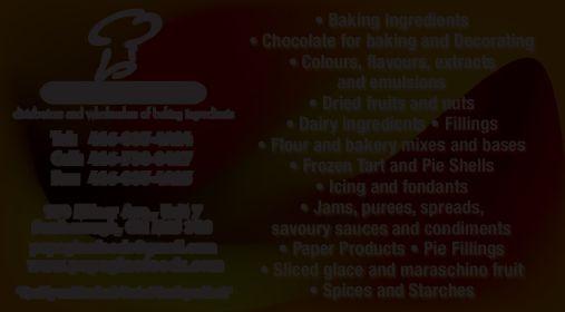 Products offered: Complete line of dry and frozen products for all your bakery needs including paper, cleaning supplies, cake decorating and frozen finished products. Suppliers of house brands: Olympic, Tasty, Bakers and our all natural Pure Foods Products line since 1936. A variety of spelt, organic, all natural and retail products are available. Areas serviced: All of Ontario (some northern areas excluded) and Quebec.