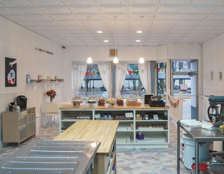 shallow coffer ceiling (Ceilume’s “Cambridge” style). Saint Cupcake pursued a similar strategy, using a contemporary ceiling pattern called Roman Circles that recalls cupcake baking pans. In both projects, the decorative ceiling provided a way for the shop itself to express the concept essential to the brand, the idea of baking with style.