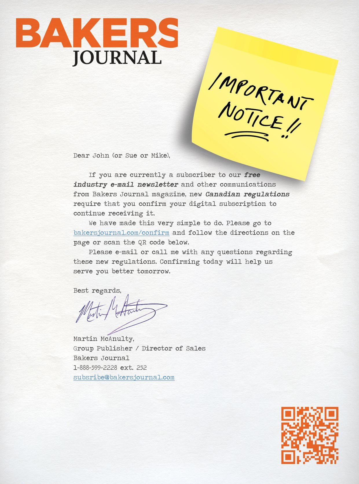 Send your subscription request to: bakers Journal p o box 530, Simcoe, on n3y 4n5 tel: 1-866-790-6070 ext. 206 Fax: 1-877-624-1940 email: subscribe@bakersjournal.com