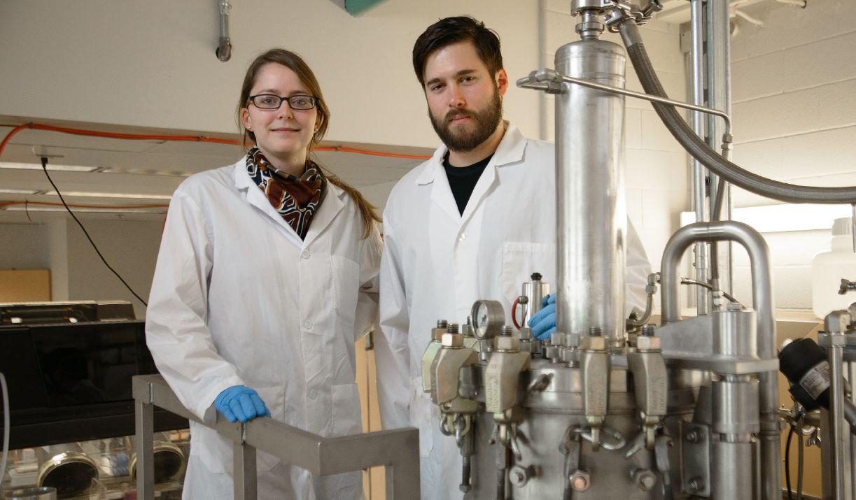 Valerie Orr and Garret Munch in the lab at Western University with Munch’s bioreactor.