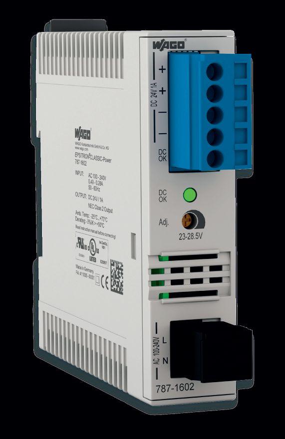 marking and push-in CAGE CLAMP technology. It also provides positive feedback during actuation and will never stick in the open position. Other benefits include a push-in of solid and ferruled conductors, simplified wiring applications, reduced cabinet space on the rail by 50 per cent, and shared accessories across the entire series of products. Applications to consider for use of TOPJOB S new 2202 series include PLC wiring, power distribution and applications with smaller enclosures. wago.com