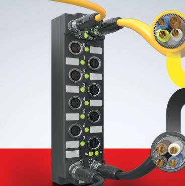 EtherCAT P integrates EtherCAT communication with system and peripheral voltage supply in one 4-wire standard Ethernet cable. The I/O system for EtherCAT P with IP 67 protection takes full advantage of One Cable Automation: material and installation costs, as well as the required installation space in drag chains, cable trays and control cabinets are significantly reduced. The compact and robust I/O modules cover a wide signal range, from standard digital I/Os to complex analog signals and measurement technology. More than 100 additional EtherCAT P components are available. Find out more now!