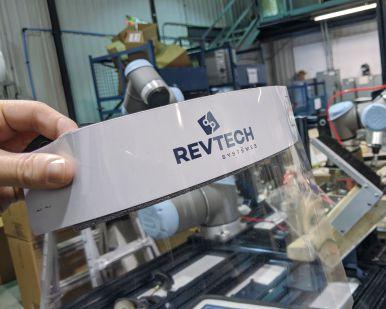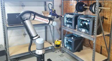 “[We’re] excited to see our partners helping the community, deploying collaborative robots in making critical PPE available to first responders, schools and nursing homes. Hats off to our Canadian Certified Systems Integrators, Revtech Systems [pictured above] and Hannafin Automation [below], that in record time were able to take their UR cobots and put them to work in new impressive application cells, each day producing hundreds of face shields. In times like these, ‘flexible automation’ has a new ring to it.”