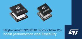 STMicroelectronics’s new high-current motor-drive series currently offers two STSPIN9 devices, targeting high-end industrial appliances.The 4.5A STSPIN948 and 5.0A STSPIN958 integrate PWM control logic and a 58V power stage with system protection and two operational amplifiers for current sensing. They are suitable for driving brushed DC motors and bipolar stepper motors. The STSPIN948 contains two full bridges that can be configured to work in different modalities. With a choice of current control based on PWM with fixed off-time or a programmable threshold, the STSPIN948 can be used in five different modes. This 4.5A IC is packaged as a 7mm x 7mm VQFPN48. The STSPIN958 contains a single full bridge that can be configured to drive two unidirectional motors, one bidirectional brushed DC motor, or one higher-current unidirectional motor by parallelizing the outputs. This IC supports seven different driving methods. The 5.0A STSPIN958 is housed in a 5mm x 5mm VFQFPN32 package. The STSPIN948 and STSPIN958 motor drivers can be used in a variety of industrial applications, including factory automation systems, industrial robots and industrial appliances, among others. Both drivers let the designer program the output transistors’ slew rate to 0.3V/ns, 0.6V/ns, 1.2V/ns, or 2V/ns using an external resistor. Dead time is built in to prevent shoot through and each MOSFET has onresistance of only 200mΩ. The