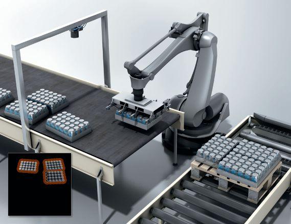 the system determines the exact position and orientation of part. The system then determines the optimum way to grasp the part. Finally, a 3D motion analysis determines how the robot will move the part.