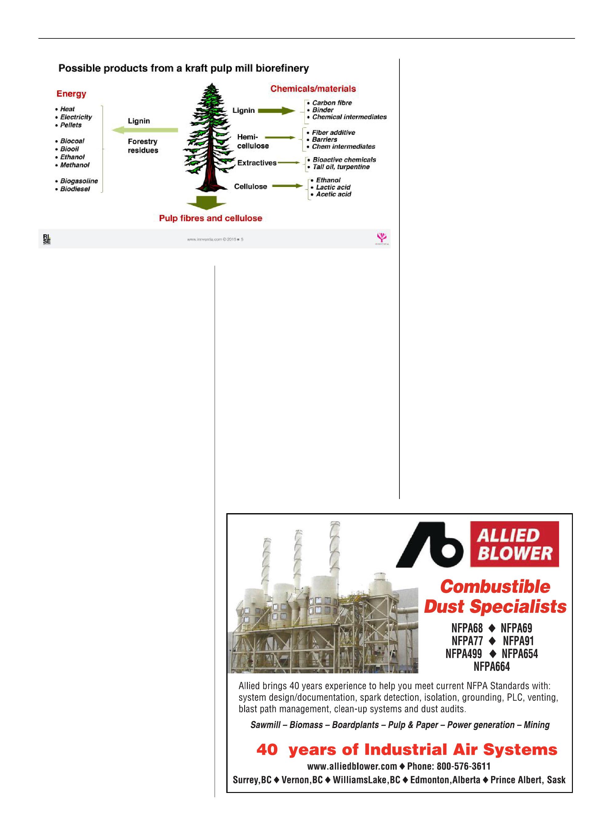 Plymouth, N.C. mill, and Stora Enso’s Sunila mill in Finland, both using Valmet’s LignoBoost technology to produce lignin; West Fraser’s Hinton, Alta. mill, using FPInnovation’s Lignoforce technology to produce lignin, and UPM’s Lappeenranta biorefinery, producing BioVerno – a biodiesel from tall oil.