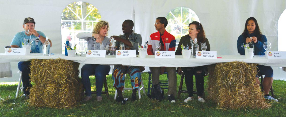 Port Hope Butter Tart Taste-Off judges (l-r) Sean Carthew, Karen Mealing, Adjoa Ducan, Errol Nazareth, Emma Waverman, and Jenny Truong.
