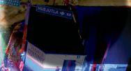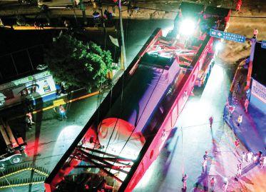 He slowly started crawling up the ramp, booming down tight to the building in front of him to try and balance the crane. Once he was at midpoint of the tracks at the top of the ramp, the crane slowly started to lean forward, every inch he crawled forward the more he would boom up to avoid touching the building. Slowly but surely the crane leveled out and he crawled into final position.