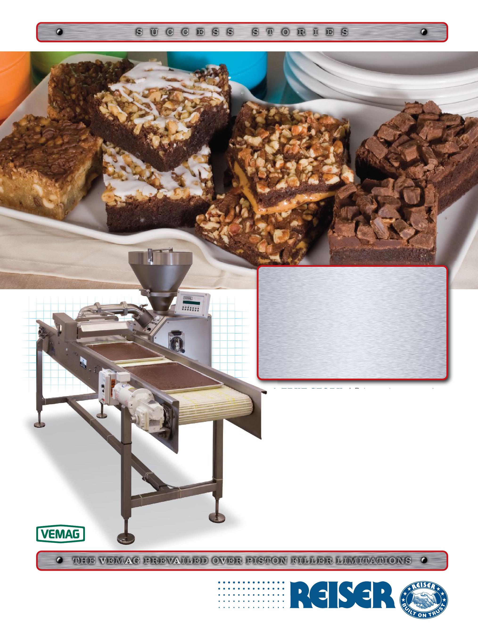 A T R U E S T O R Y : A Reiser customer was using a Vemag Depositor to successfully portion gourmet cookies and scones. She wanted to expand into brownie products and decided to purchase a piston filler to do the job. She quickly discovered the limitations of the piston filler – the batter had to be made less viscous to run through the machine and it required hand-spreading to fill the tray corners. Realizing how happy she was with her Vemag, she asked Reiser’s bakery specialists to engineer a solution. The result was a Reiser 18-inch Rotary Sheeter that attached to the Vemag. This heavy-duty device allowed her to make the brownies as thick and chocolatey as she originally envisioned. The Sheeter’s full-width extrusion completely filled the pan, eliminating all hand lab or It was the perfect solution! Her vocal support resulted in sales at other plants as she spread the word of Vemag’s ability to sheet viscous batters and cookie doughs