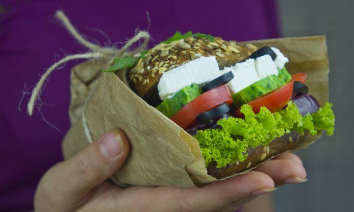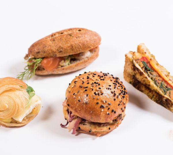 a brioche mustard bun topped with homemade coleslaw and deep fried horseradish. For the second sandwich, they took a mini croissant bun and topped it with brie, marinated endive cooked sous vide style in orange butter, plum sauce and garnishes. The third sandwich made use of their nutritional bun and filled it with brined salmon and gin-salt cured salmon marinated with maple syrup, Limoncello and herbs. They also made a salmon cream cheese spread that was piped on, and then added lemon and lime zest, pink peppercorns, dill, seasonings and garnishes. The fourth sandwich was a vegetarian panini cut into triangles with lots of colour and flavour.