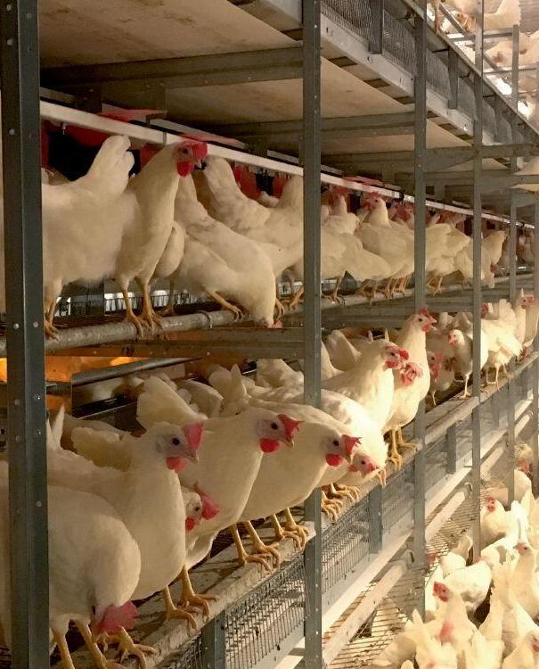 The barn includes five tiers and four rows of Big Dutchman’s Avech 2242 enriched system.