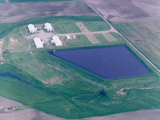 An aerial view of a manure lagoon; specifically, a swine treatment manure lagoon.