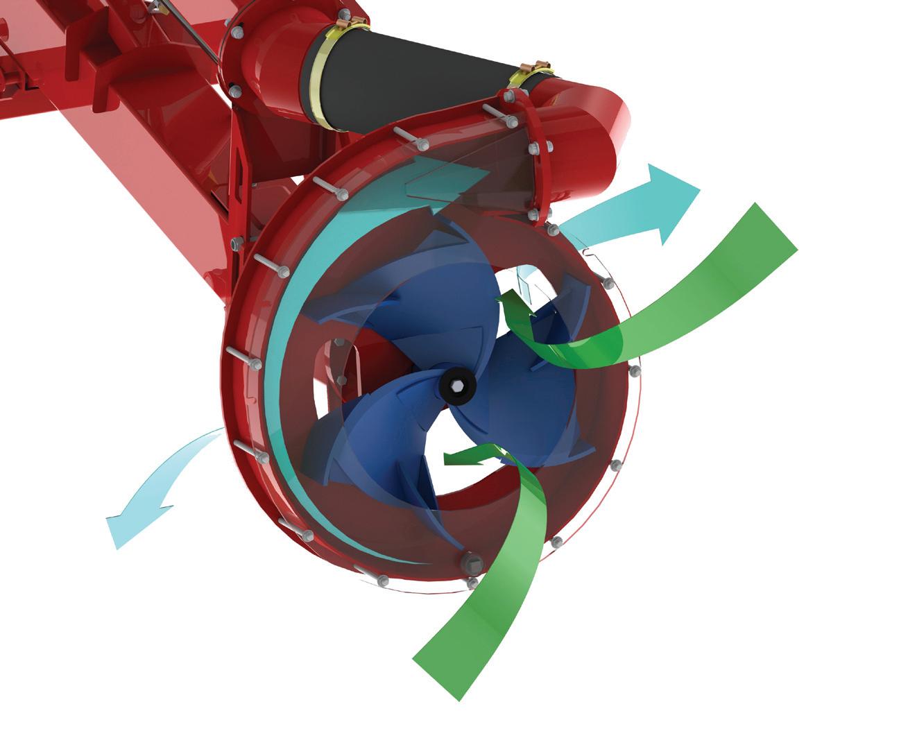 sales manager for Jamesway. “First, the turbine core pushes manure into the impeller blades, in effect supercharging the pump capacity, which is very noticeable in thicker material. Secondly, the rest of the turbine output is vented right through the pump housing to move processed manure away from the pump. The huge throughput of the turbine produces incredible intake suction that pulls solids into the cutter knives, chopping up the largest rafts of solids in mere seconds. It’s a lot like passing through a jet engine…not much survives the trip.”