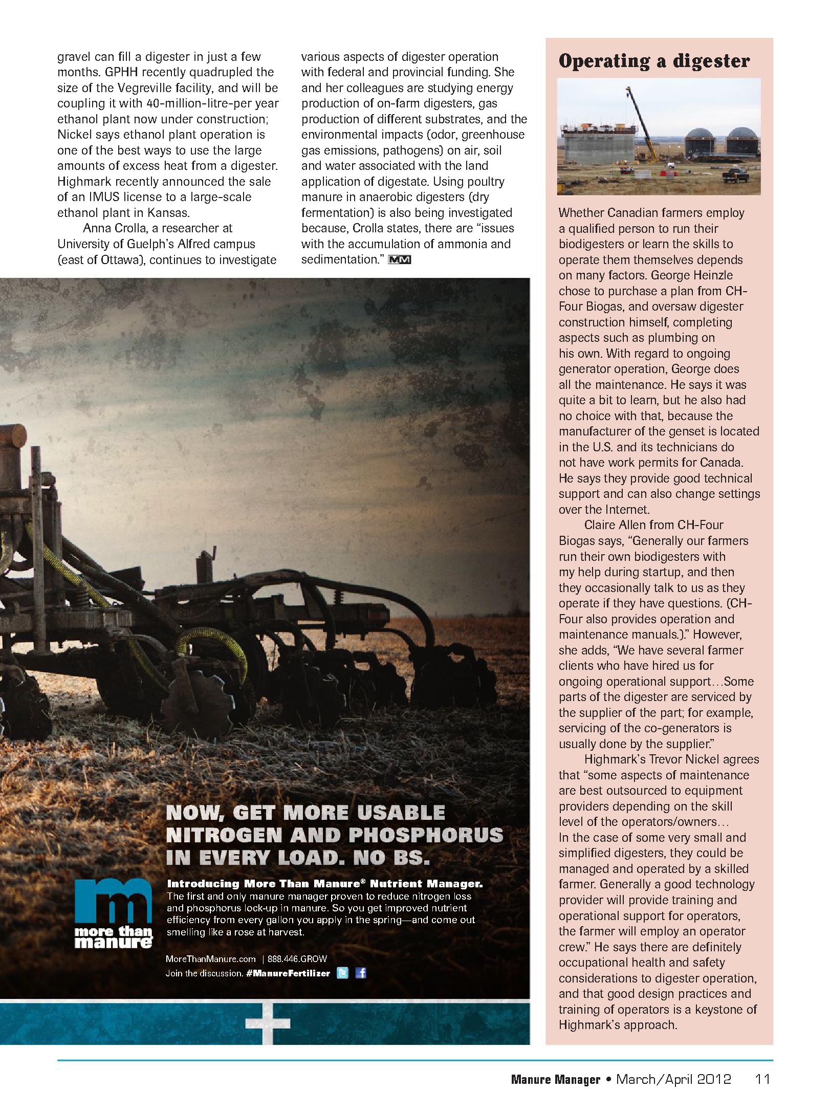 CH-Four has nine systems running in Canada, one in New York state and three more being constructed in Canada. All CH-Four systems are combined heat & power (CHP); they have one under construction in Canada that will use hog manure (sludge from pits under the hog pens that is washed into anaerobic lagoons) as the primary feedstock.