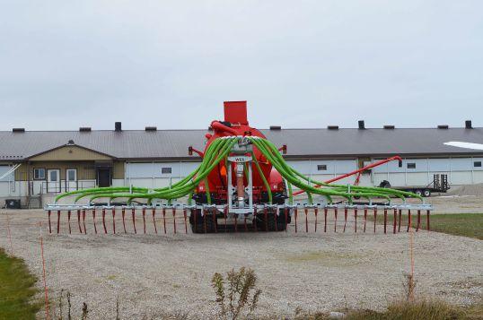 Joskin showed its new high performance 12m slurry boom in its Start range. Whereas the previous 12m model had a single macerator to distribute the slurry into the 44 hoses, the new version is now equipped with two Scalper macerators and four additional hoses.