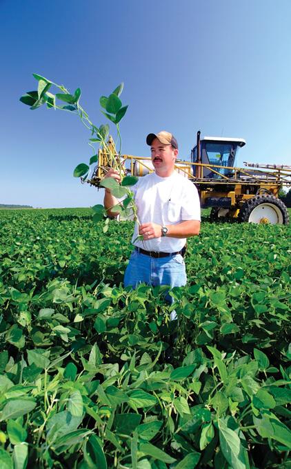 Chris Pearson examines a soybean plant growing on Meadowlane Farms.