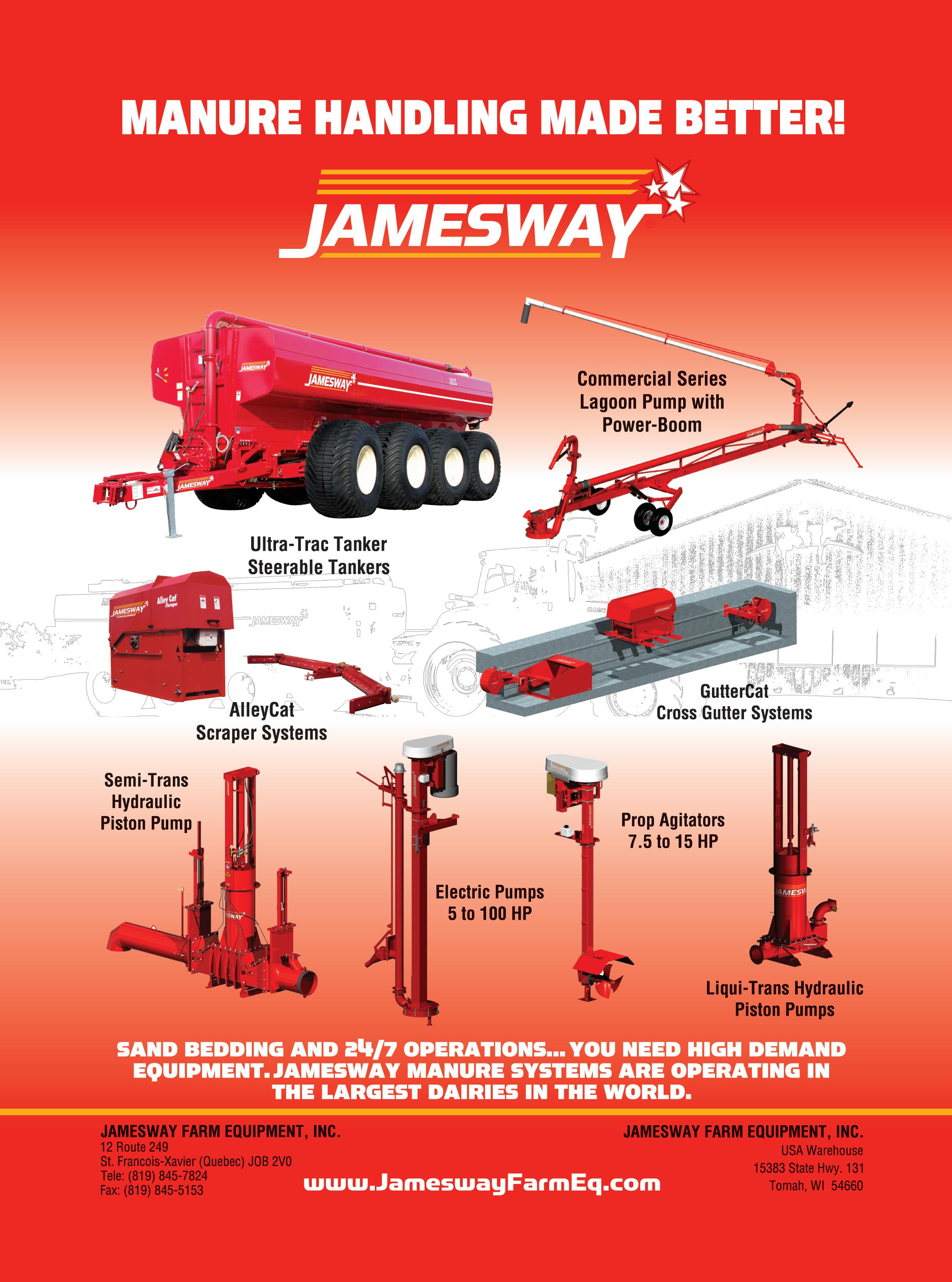Jamesway Transfer Kits use all bolted connections so the transfer arm may be mounted on the left or right. Bolt-on accessories include high-mount spread nozzle, low-mount spread nozzle or hose connection kit for long distance transfer. The kit may be configured with the input from the top, bottom or side to accommodate a wide range of retrofit applications, and the controls may be rear mounted or cab mounted. The impeller kit is all T1 steel and features a swingopen front for easy service or cleaning. The hydraulic drive motor is mounted to the proven oilbath bearing chamber found on all Jamesway pump kits. www.jameswayfarmeq.com