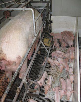 The farrowing barn has a shallow pit with a sloping floor underneath. The depth is about eight to 15 inches and the plugs are pulled about every three weeks to drain it into the pig gestation/ breeding barn.
