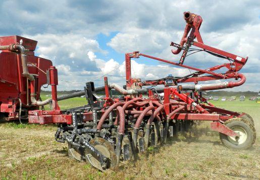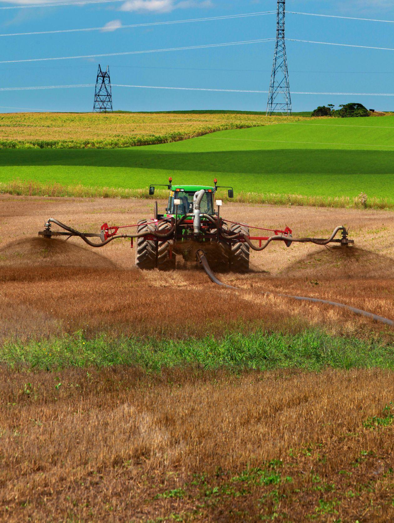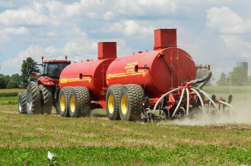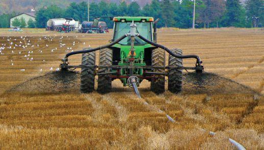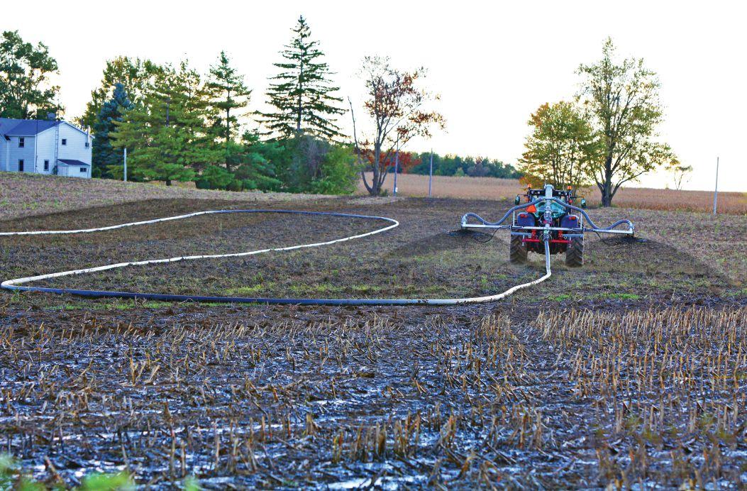 Prior to injection, an agitation pump stirs the pits so that the nutrient content in the liquid manure is balanced once it reaches the field. The agitated manure is pumped into a semi-trailer tanker and trucked to the application site, where it is transferred to one of two field applicator tanks, which have a total hauling capacity of about 10,000 gallons. The manure is then applied below ground into a furrow created by a coulter disk on the manure application drawbar. The manure can be applied anywhere from two to six inches into the soil. Covering disks located behind the application nozzles on the drawbar cover the furrow.