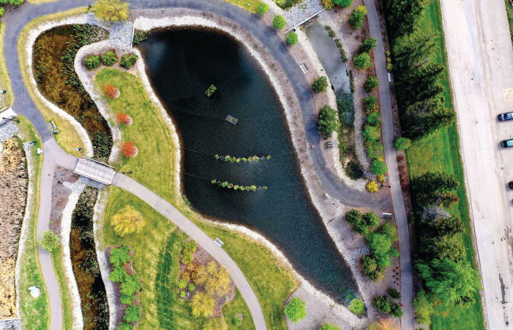 filtration system, with the plants taking up nitrogen and phosphorus from the runoff water and adding oxygen from the atmosphere to the holding ponds through their root systems, essentially seeding the water with oxygen.