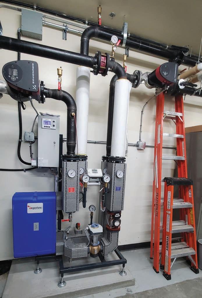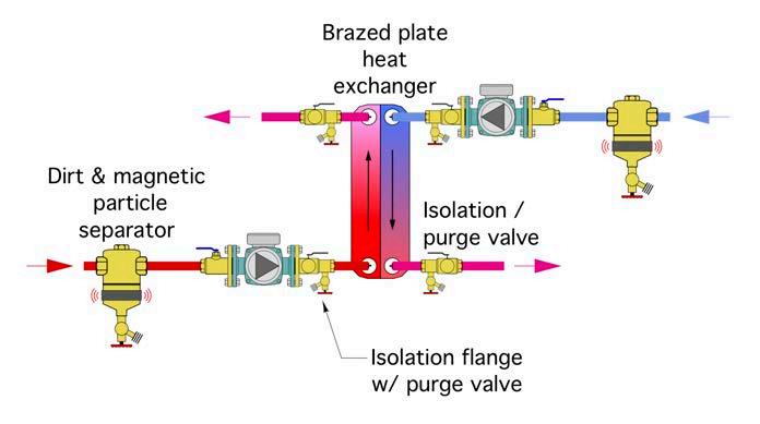 1. “Cleanliness is next to godliness" when it comes to heat exchanger performance. It’s always a good idea to put a high efficiency dirt separator, preferably one with a magnet, up stream of both inlet ports of any heat exchanger. You can see these in Figure 5, along with isolation and purging valves. The latter can be used, if ever necessary, the isolate each side of the heat exchanger and chemically clean scaling from internal surfaces.