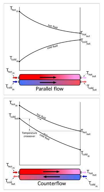 Figure 3. There are two ways to pipe up a flat plate heat exchanger: parallel flow or counterflow.
