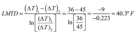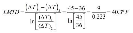 Just carefully put the numbers into the formula. Let (∆T)1 be assigned to the top end of the heat exchanger. Thus (∆T)1 = 122-77 = 45F. This means that (∆T)2 is at bottom end of the heat exchanger. Thus (∆T)2 = 104-68 = 36F. Putting these values into Formula 1 yields: