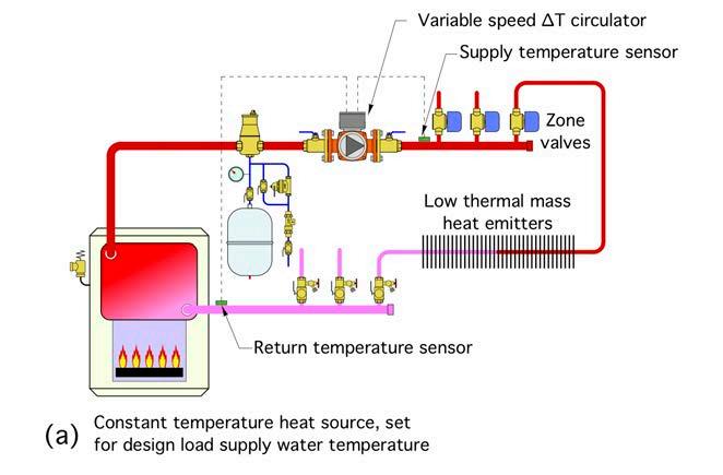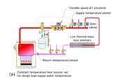 3. The heat source maintains a constant supply water temperature, at the design load value, whenever any zone is calling for heat. Figure 1 shows examples of two systems that meet these criteria.