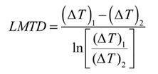 The rate of heat transfer depends on how the temperature differences at all locations along the fluid pathways “average out.” Heat transfer theory can be used to prove that this average temperature difference, which is more specifically called the “log mean temperature difference” (abbreviated at LMTD), can be calculated using Formula 1.