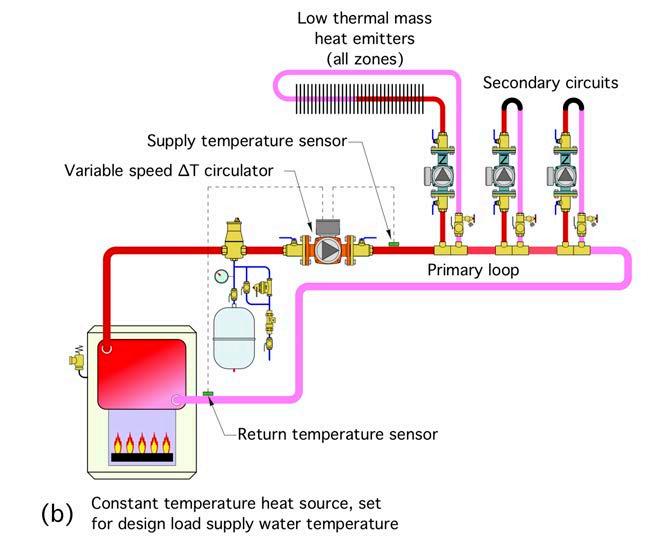 The requirement that the distribution system have low thermal mass heat emitters implies that the temperature changes on the return side of the system would appear quickly as zones turn on and off.