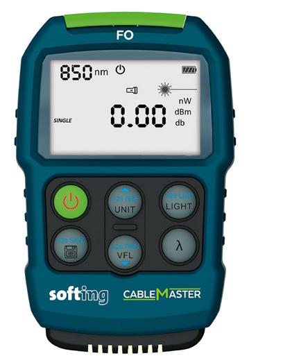 Designed as a pocket-sized tool, CableMaster FO is portable across the jobsite and features a USBrechargeable battery capable of up to 80 hours of operation. All measurements are easily readable on the device’s clear digital display. Applications include measuring fiber light loss or signal strength at the opposite end of a fiber. itnetworks.softing.com