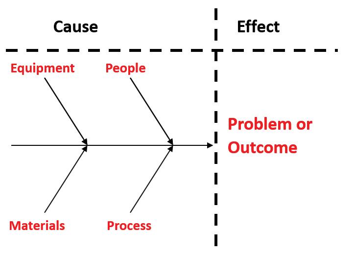 This fishbone diagram (below) is a basic tool used in root cause analysis. We know that the “effect” is that the machine is down, but what is the true “cause” of the failure.