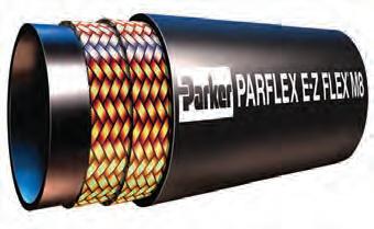 M8 series E-Z Flex hybrid hose from Parker Hannifin, manufactured from thermoplastic and rubber, is a two-wire braid construction with fourspiral wire hose performance. This robust hose can handle high-pressure applications without compromising flexibility. The design allows for a smaller O.D., creating a tighter bend radius and easier handling. It is also lighter, making it easier to route. The bend radius for a 5/8-in. I.D. hose, for example, is only 4 in. The hoses are mechanically bonded, rather than chemically bonded, creating a hose with a low volumetric expansion and allowing it to handle synthetic and waterbased fluids during a long service life. The