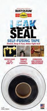 Rust-Oleum Industrial Brands has introduced LeakSeal self-fusing silicone tape, a silicone repair tape that creates an air-tight bond and conforms to any surface to provide a water-tight seal. It does not stick to the substrate to which it is applied, but rather fuses with itself. It demonstrates extreme strength by withstanding 700 psi, is extremely resistant to temperatures that range from minus 85°F up to plus 500°F, and can withstand most solvents, acids and oils. The tape is easy to apply and remove, and leaves no sticky residue. Available in 10-ft rolls in black and opaque, it can be used for fixing leaky pipes and hoses or for insulating frayed electrical wires.