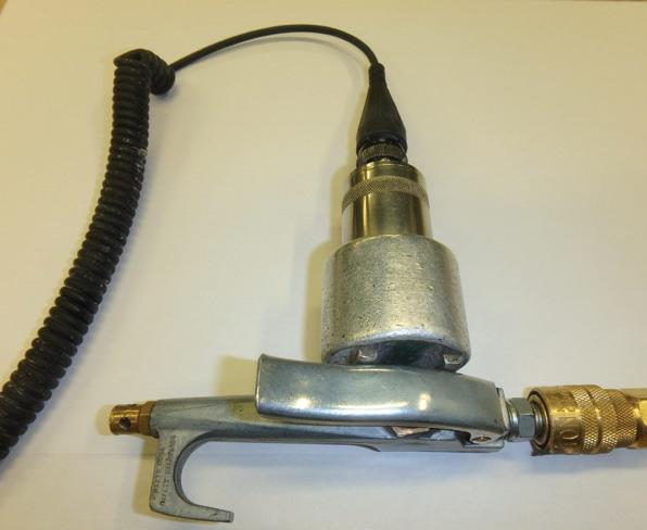 An accelerometer with a magnetic base was attached to the trigger nozzle on an air hose in the maintenance shop (Figure 3). With the data collector in live mode measuring overall gSE, the nozzle was triggered open and closed. The change in the overall spike energy level was observed. Once this reaction was confirmed, the data collector was set to