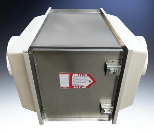 CleanAire HEPA and Carbon Filter packs mount inline in the exhaust ducting from a fume hood or contaminant source up to 1,500 cfm. The pack includes a galvanized steel housing with hinged and gasketed access door for filter change out, and molded composite resin inlet and outlet plenums, with duct connection collars sized to specification.