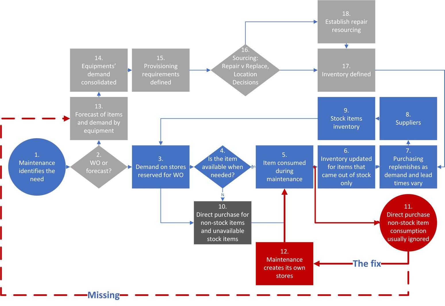 to satisfy operational needs. The dashed red line is typically missing, yet if organizations used it, the hidden maintenance stores could disappear. Missing parts translate into equipment downtime, lost revenue and avoidable workaround costs including maintenance overtime, contractors, spare part stashes, and rushed deliveries.