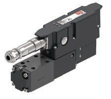 The valve provides stable flow control and smooth actuator movement through features such as flow linearization and adjustable dither and deadband settings. Models are available in single-stage and two-stage configurations covering NG06 to NG32 sizes.
