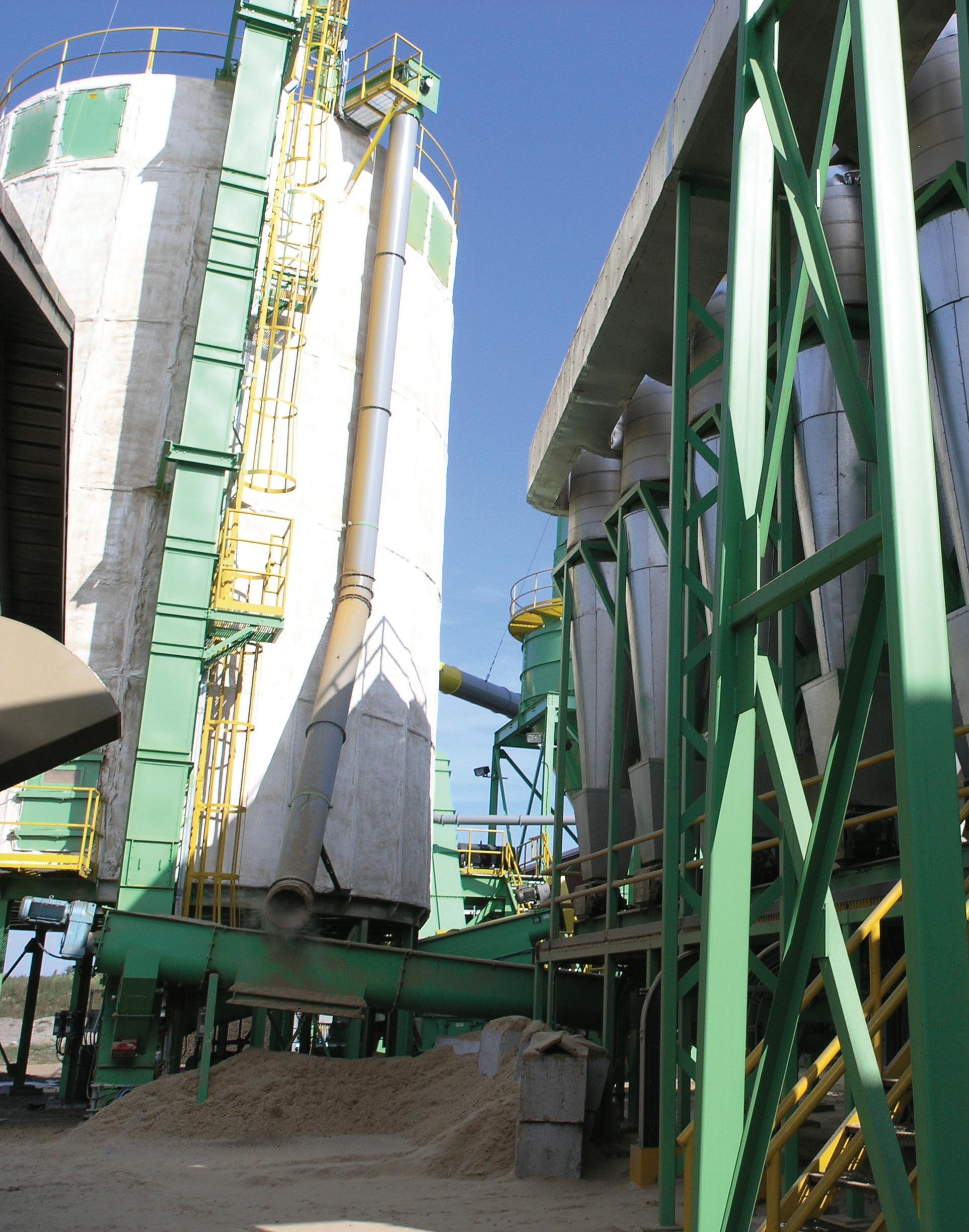 LEFT MAIN: The single-pass rotary dryer and cyclones were supplied by bulk drying pioneer Thompson Dehydrating Co. In the background: A reversing screw at the dry bin infeed allows problematic material to be dumped to the ground out of harm’s way. INSET: The Brunette BioSizer provides a lot of flexibility up front, handling bark for the KMW energy system but pinch-hitting to create raw material for production as required.