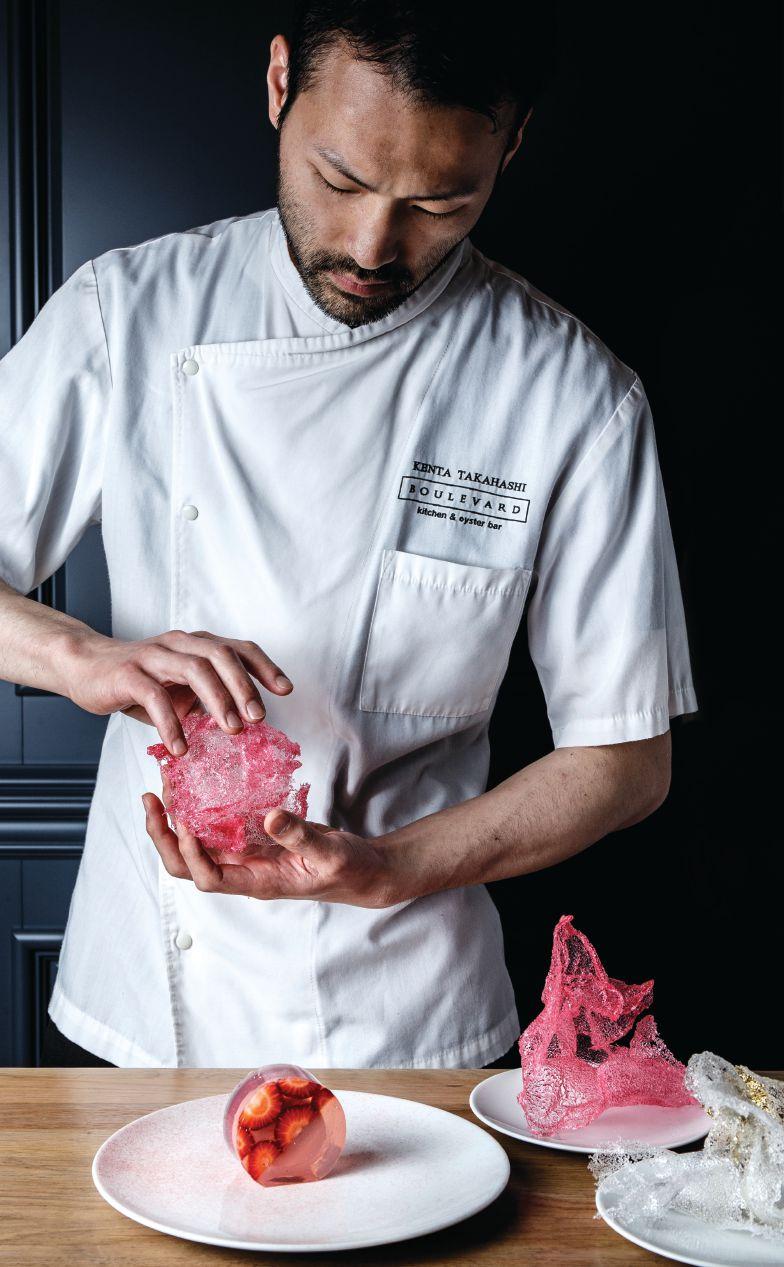 In the winter, with less fresh produce available, Takahashi likes to offer restaurant patrons the sesame praline bar. “It’s made with gianduja crunch, roasted white sesame gianduja crunch, salted black sesame ganache, Madagascar dark chocolate mousse, sesame mousse, sesame tuille and decadent caramel ice cream. “