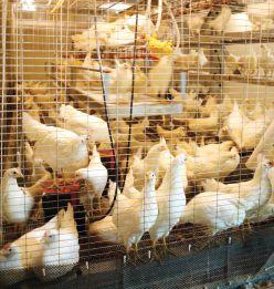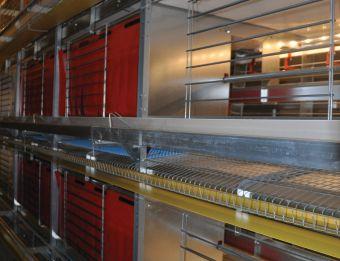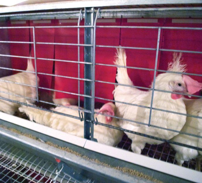 les cages comptent deux perchoirs parallèles, juste assez hauts pour qu’un ?uf puisse rouler en dessous. elles ont aussi des rideaux pour isoler le nid de ponte, qui est situé à une extrémité, à l’avant de la cage, pour minimiser le déplacement des oeufs.