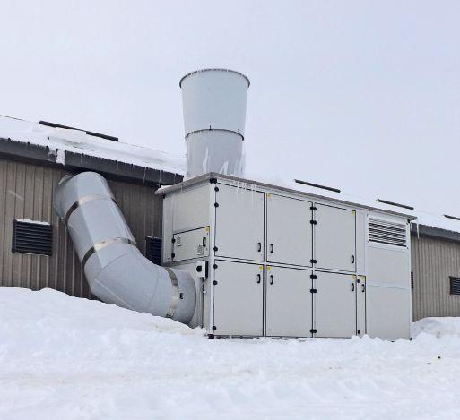la ventilation du bâtiment à l’aide d’un mélangeur d’air assure 25 cfm d’air frais pour les poules, ce qui fait aussi sécher le fumier jusqu’à environ 35 à 40 % de contenu en eau. l’apport d’air peut provenir directement de l’extérieur par les entrées linéaires sur les murs, notamment en été, ou être filtré et recirculé en hiver.