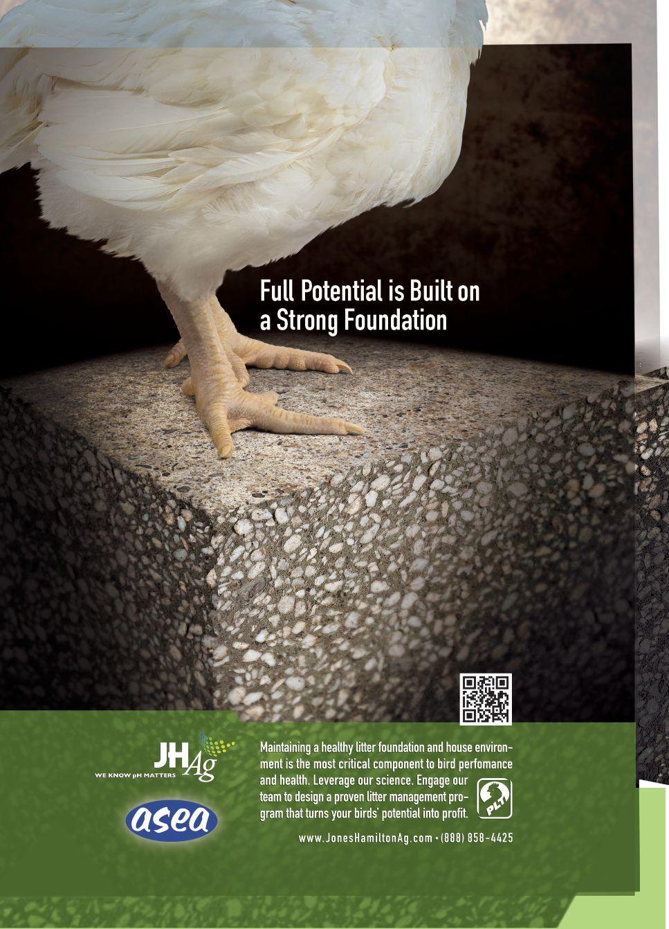 Getting a flock off to the right start is critical not only for the birds, but also for financial gain. It’s easy to forget the small details that, in the end, cost greatly. A solid, strong foundation and the understanding that anything that is done to the environment that the birds are in direct contact with ( i.e., water, feed, air and the floor) will impact them for better or for worse. An optimally managed environment provides the best chance of maximizing a flock’s health and financial potential. There are no silver bullets to litter management of ammonia and bacterial challenges. Focusing on the things that impact or produce them, however, is the key to a successful flock. n