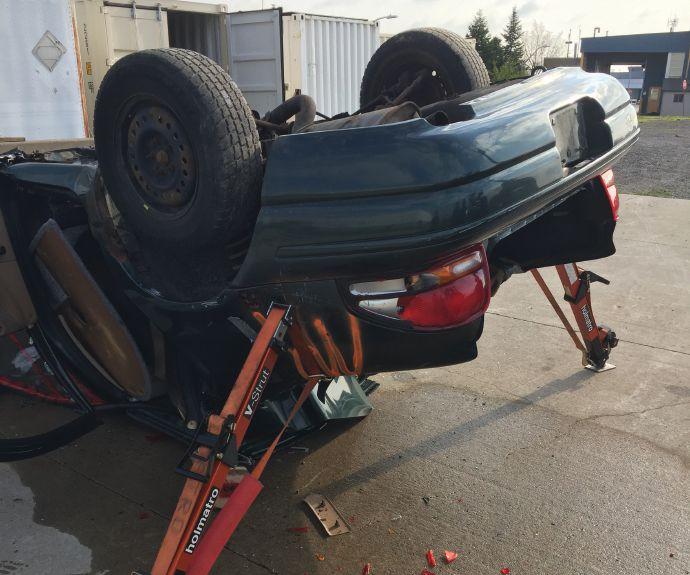 Next is our vehicle on its roof. The application of struts on a vehicle in these situations can greatly increase our extrication paths. While in past, the building of box cribs to support the back side of the vehicle would severely hamper one of our biggest extrication windows. With proper application of the struts at the rear of the vehicle and minding the strap properly, we can affectively stabilize our vehicle and keep the rear window and trunk area open for a much larger extrication path if needed.