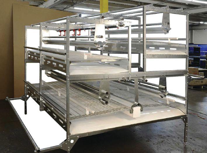 Unlike the complex multi-tier aviaries used by many of the larger cage-free egg producers, the modified floor systems do not have integrated nests. The configuration preferred by many specialty producers is two rows of multi-tiered systems along the walls of a house with nests located down the centre, providing a separate area for laying.