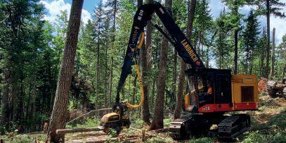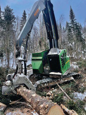 En plus du transporteur Ecolog, Gabriel Leblond travaille avec une abatteuse John Deere 803 MH munie d’une tête LogMax 7000 extrême et une pelle Linkbelt 145x4.